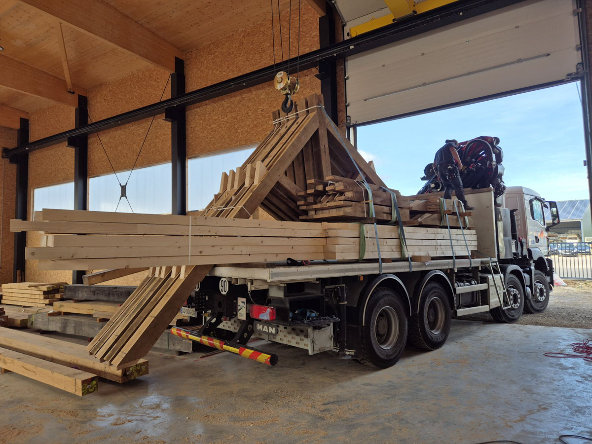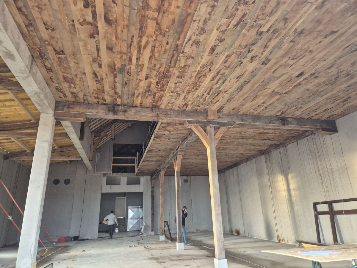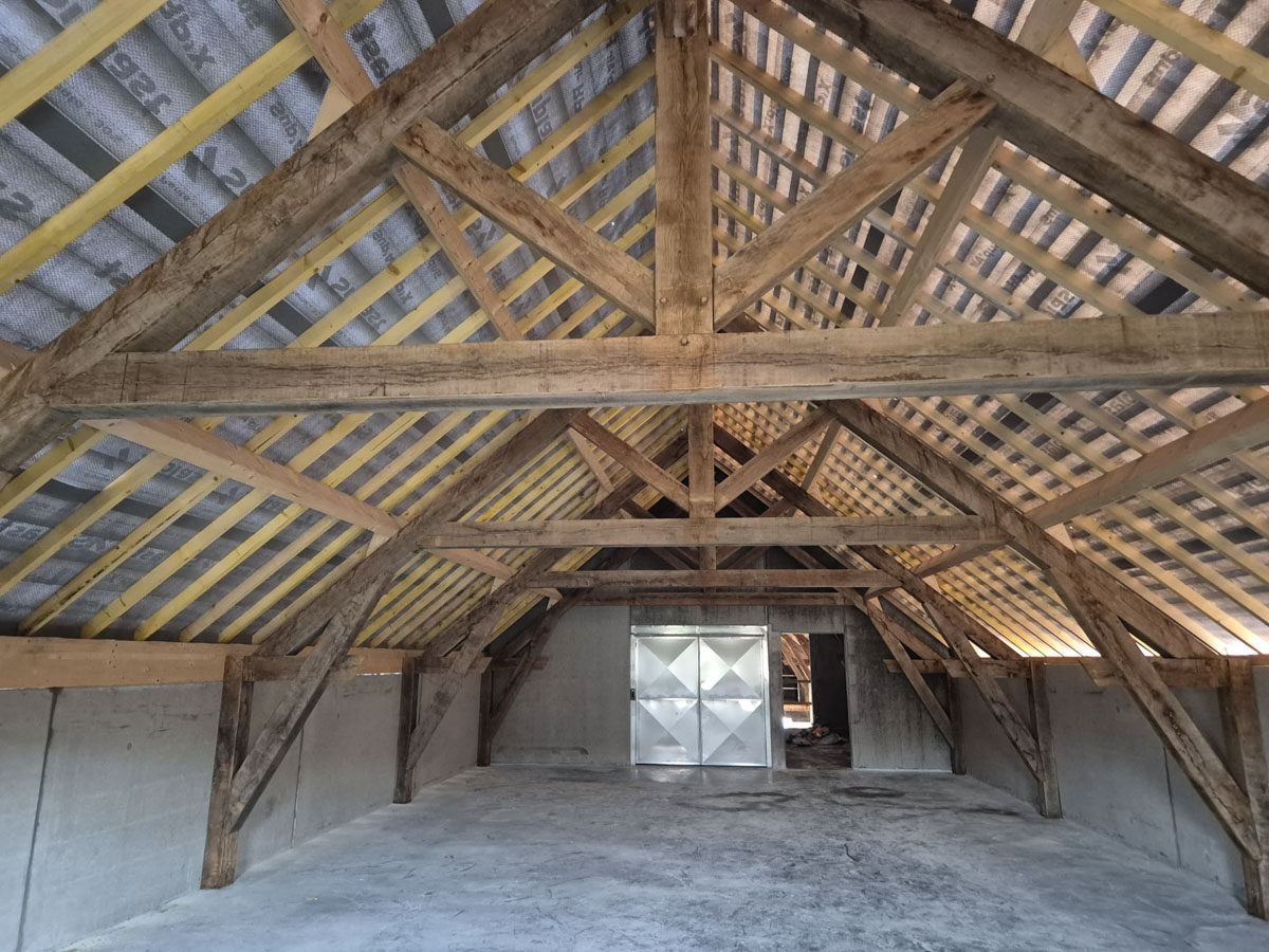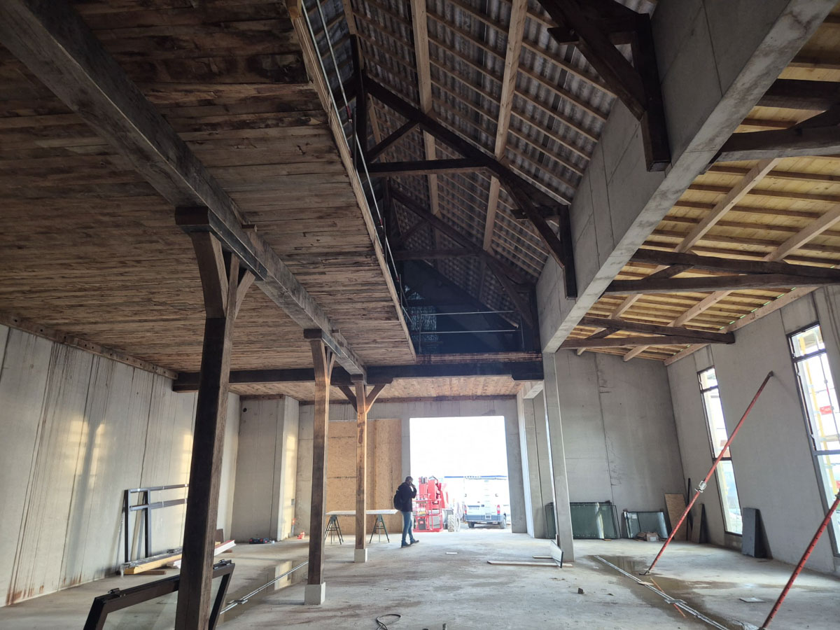 En complément de la charpente en chêne, le bâtiment intègre un plancher en CLT (bois lamellé croisé).